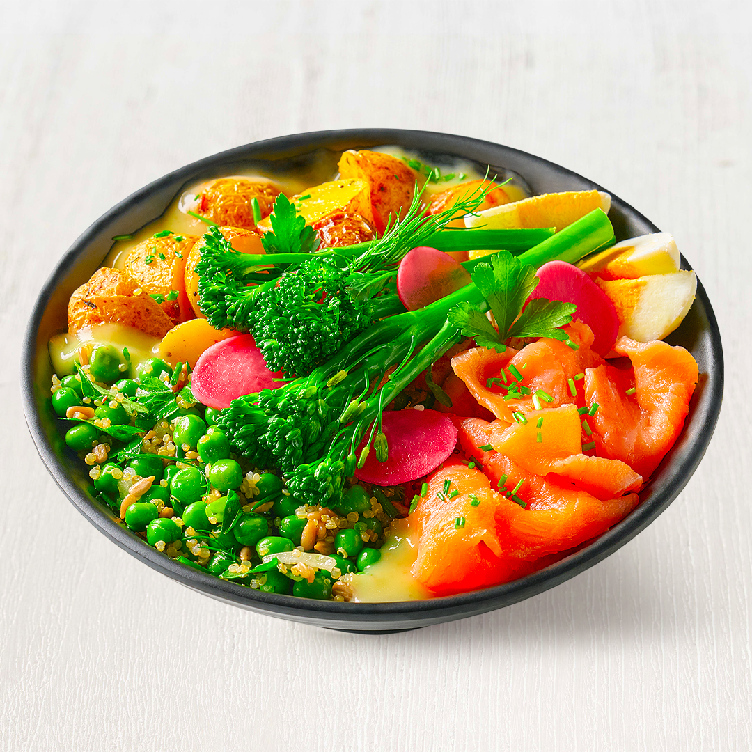 Složení: bylinková omáčka, bylinkové brambory, salsa hrášek quinoa bylinky, vejce, brokolice, uzený losos plátkovaný, nakládané ředkvičky